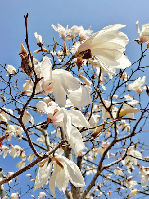 青空に映える真っ白な花びらが、春の始まりを告げています。